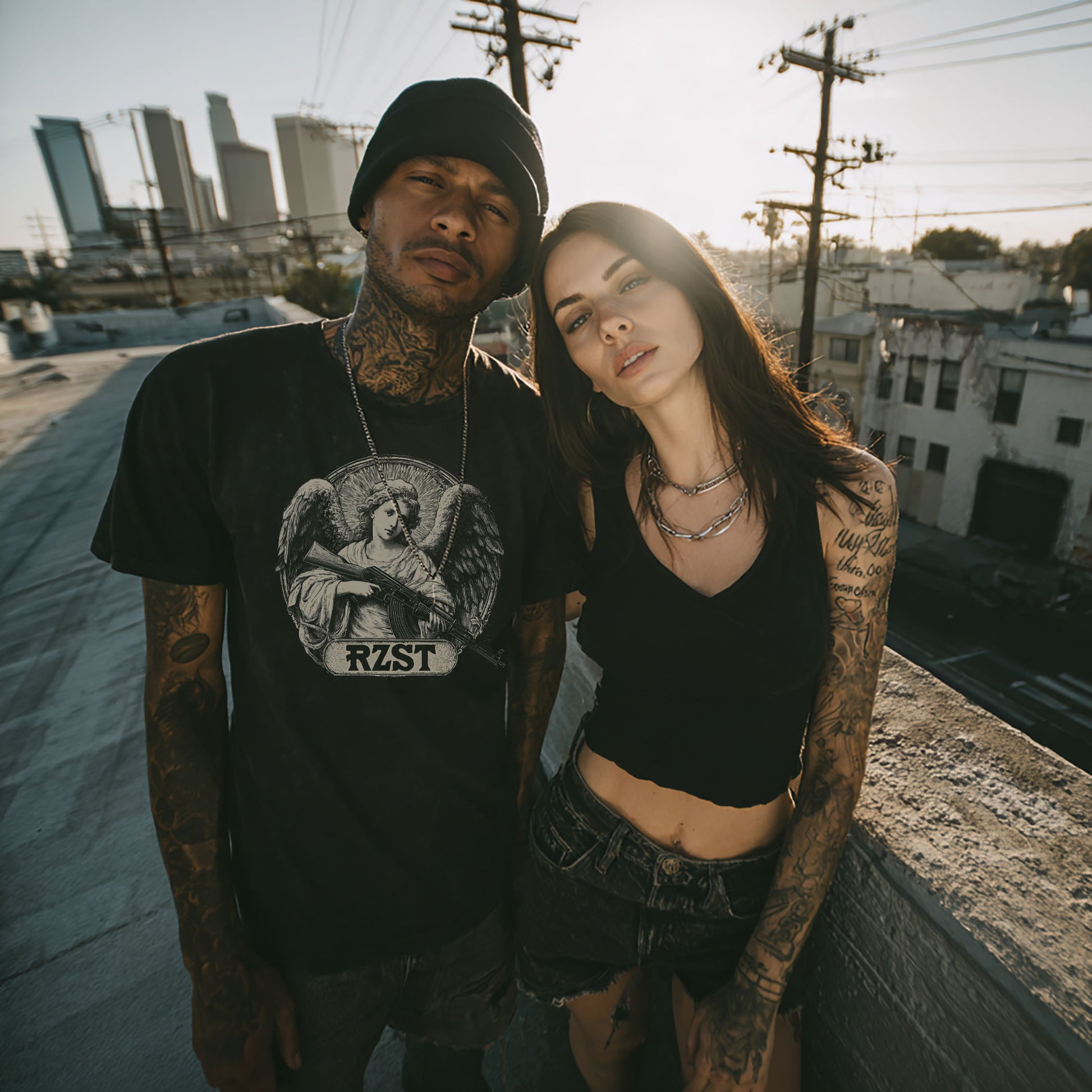 For RZST, this design represents standing firm in a broken world. It speaks to the idea that purity and righteousness are not fragile; they can coexist with strength and confrontation. The angel is not a symbol of violence, but of readiness—the willingness to protect values, identity, and freedom when they are threatened. The vintage style reinforces the timeless nature of this message: resistance is not a trend, it’s a legacy.